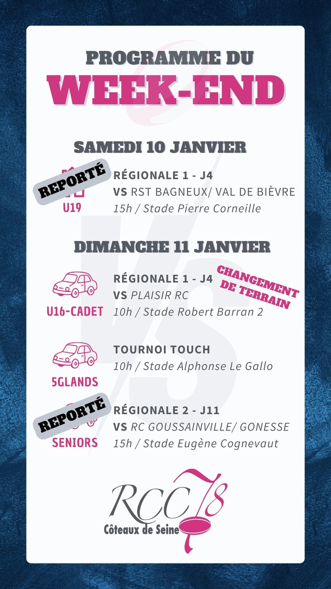 #RCC78 #ProgrammeDuWeekend #InfoClub #Météo #Rugby #U16 #U19 #Seniors #TouchRugby #OnNeLacheRien